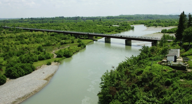 Fotoğrafta Abhaz-Gürcü sınırındaki geçiş noktası olan İngur Köprüsü görülüyor.