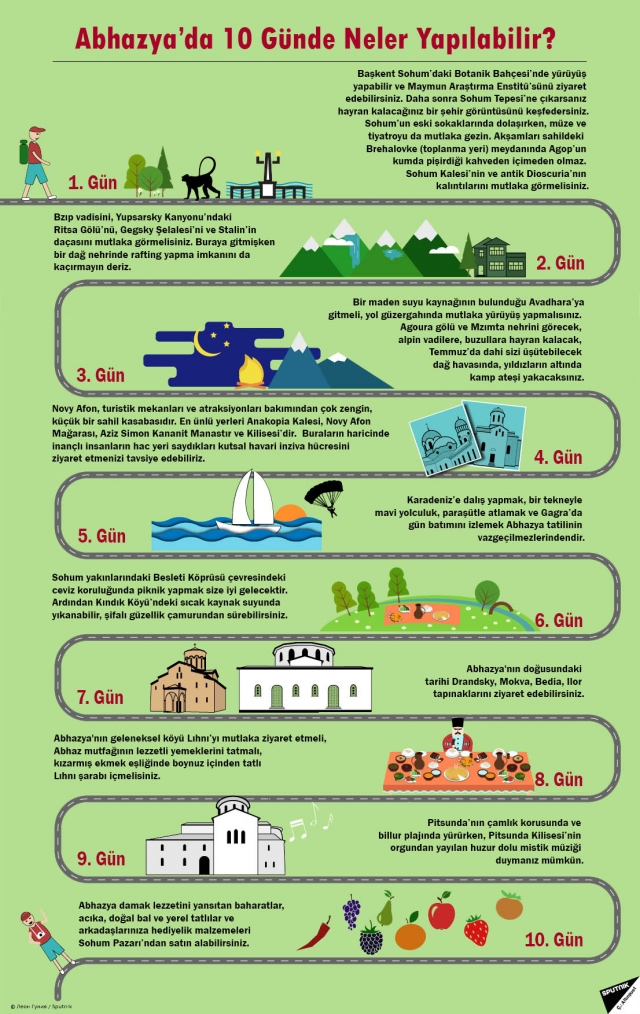 Abhazya’nın fantastik renklerini hissedebilmek, ülkenin özelliklerini ve inceliklerini öğrenmek turistler için elbette ki çok zaman alacaktır. Yapılacak 10 günlük tatil bunun için az görünüyor belki, ama iyi bir planlamayla bu süre, “Ruhlar Ülkesi”ne yapacağınız büyük yolculuğa güzel bir başlangıç olabilir…