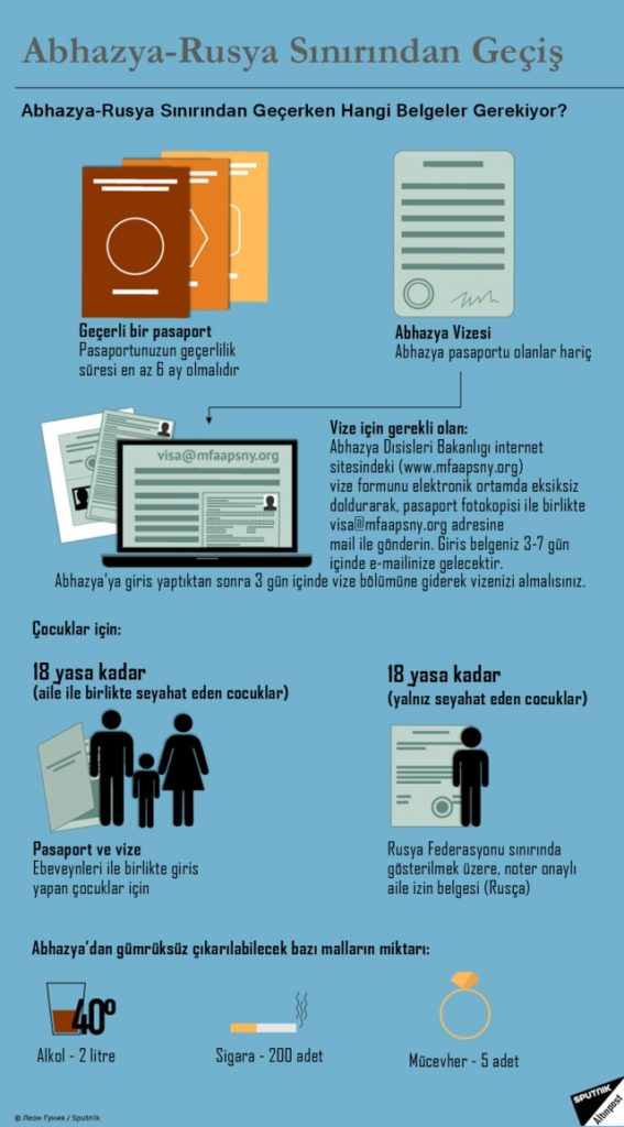 Abhazya -Rusya sınırından geçişlerde hangi belgelerin gerekli olduğu sık sık sorulan sorular arasındadır. Turizm sezonunun başladığı bugünlerde, konuyla ilgili hazırlanmış bir grafik çalışmasını, Türkiye’den geliş gidişlerde de işinize yarayabileceğini düşünerek paylaşıyoruz.