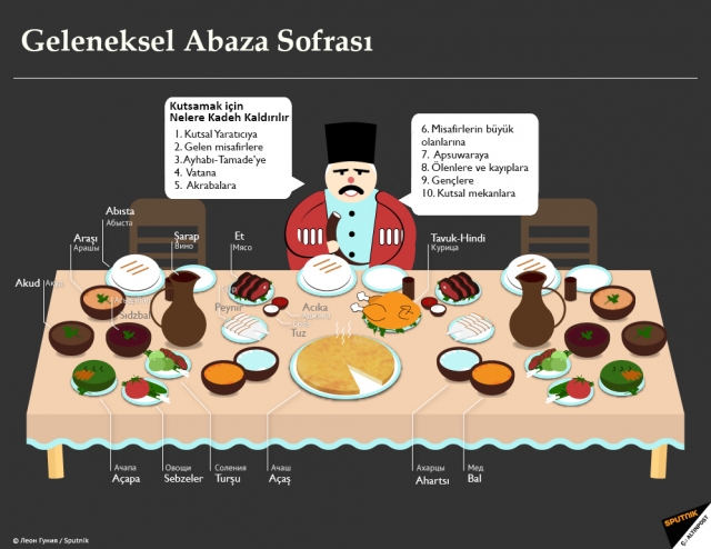 Abhaz sofrasında her zaman ilk olarak kutsal yaratıcıya şükredilir, kadeh kaldırılır ve bu dua ayakta yapılır. Eğer sofra cenaze ve yas için kurulmuşsa ayağa kalkılmaz.