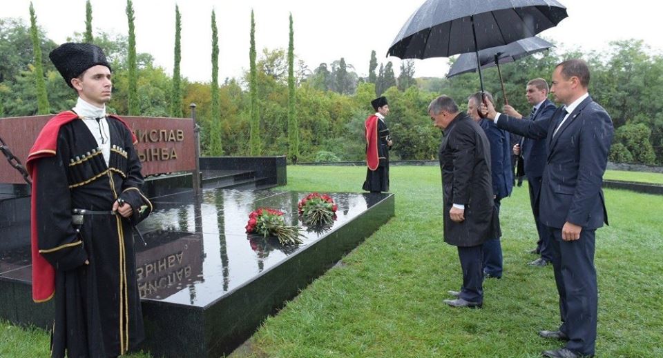 Vladislav Ardzınba (Babuşera) Havaalanı’na inen Minnikhanov’u, Abhazya Başbakanı Mikvabiya resmi törenle karşıladı. Ardından Tataristan Devlet Başkanı ve beraberindeki 24 kişilik kalabalık bir Tatar Heyeti Abhazya’nın kurucu lideri Vladislav Ardzınba’nın anıt mezarına çelenk bıraktı, saygı duruşunda bulundu. Daha sonra Abhazya Cumhurbaşkanı Raul Hacımba ile makamında bir araya gelen Minnikhanov bugün Oçamçira Limanı başta olmak üzere bir dizi fabrika ve tesiste incelemelerde bulunacak.